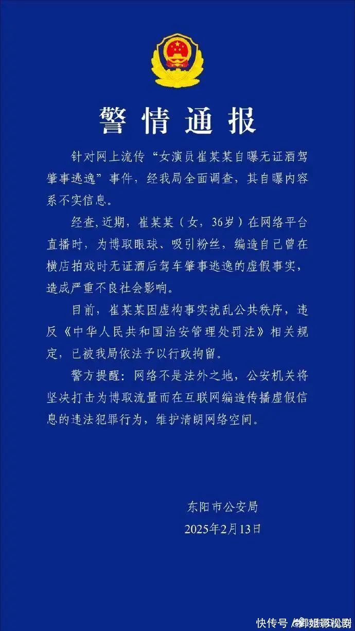 警方表示,经查,近期,崔某某(女,36岁)在网络平台直播时,为博取眼球、吸引粉丝,编造自己曾在横店拍戏时无证酒后驾车肇事逃逸的虚假事实,造成严重不良社会影响。
